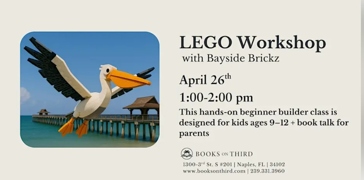 Join us for a special event for kids and parents. Kids will engage in a LEGO class while parents learn about best books for 9-12 year olds. This hands-on beginner builder class is designed for kids ages 9–12 who love to create, build, and explore their imagination with LEGO bricks. During this introductory LEGO building workshop, participants will learn basic building techniques led by Bayside Brickz instructors. Whether your child is new to LEGO building or already loves constructing their own creations, this class will help them grow their skills and confidence. Each participant will leave with: A $10 LEGO set A cup of bulk LEGO bricks (retail value $12) New building techniques and inspiration for future creations Parents Welcome Parents are invited to stay during the workshop and enjoy a book talk with one of our booksellers. We’ll discuss: The best books for ages 9–12 Ways to encourage strong reading habits for pre-teens Tips for helping kids fall in love with reading Additional LEGO Available Bayside Brickz will also have: LEGO sets available for purchase Bulk LEGO sold by the pound Workshop Ticket – $30 Ticket includes instruction, a LEGO set, and a cup of bulk LEGO bricks for your child to take home. Recommended for ages 9–12. Reserve a Spot