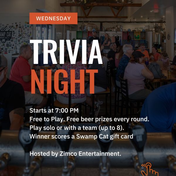 Put your knowledge to the test at Swamp Cat Brew Co. Trivia Night, hosted by ZIMCO Entertainment! Join us every Wednesday at 7 PM for a fun, free-to-play game with great beer and even better vibes. Win free beers each round and a Swamp Cat gift card for the overall winning team. ๐พ Dog-friendly ๐จโ๐ฉโ๐ง Family-friendly ๐๏ธ Free to play ๐บ Great beer, friendly competition, and bragging rights included Bring your crew, grab a pint, and play along!